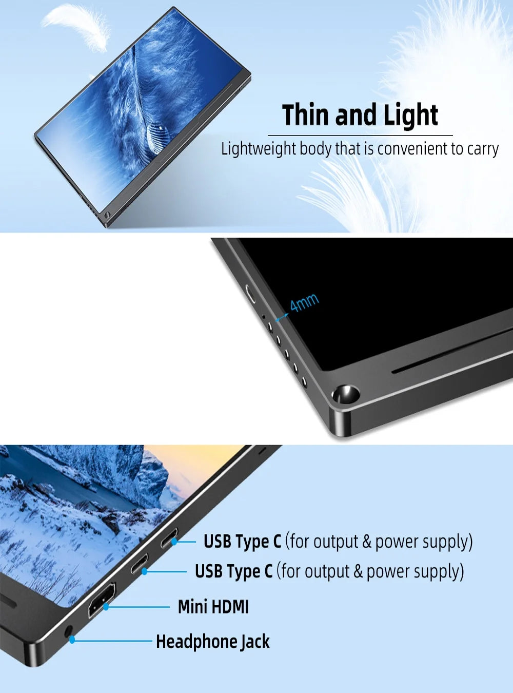 [MULTI-INTERFACE USAGE] Integrate for HDMI to transfer data signal from PC, Smartphone, FPV etc,. Note if refresh rate is less than 60HZ or device without HDMI, passing signal with HDMI cord. 3 in 1 Type-C port support one-cable connection, video signal transmission, max 100W powering. Micro USB-OTG for connecting mouse & keyboard. 3.5mm headphone jack is used to earphone output.
